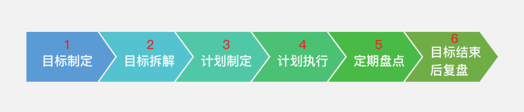 个人目标管理根据流程可以分为六个阶段:目标制定、目标拆解、计划制定、计划执行、定期盘点、目标周期结束复盘。下面我们逐一来解释这六个阶段的具体意义,以及在目标管理全流程中的作用和应该注意的问题。